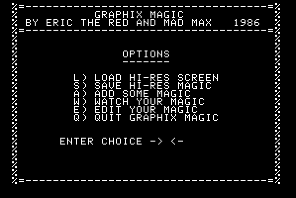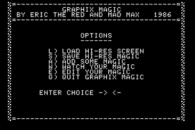 Graphix Magic is a graphics utility that allows you to move sections of a hi-res screen in any of eight directions. It also includes a few short machine language routines that introduce a hi-res page.